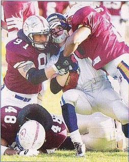 However just as the Bulls thought they had turned the corner they were mugged 14-13 by the East Kilbride Pirates in the first week of June. McNey passed for 2 TD's to Mark Squire to lead the Pirates into a 14-7 lead, but the Bulls came back with Sonny Dosanjh's QB keeper to pull within one. Pirate's LB Bob Lynch then pulled off the crucial play as he stormed through the Bulls line to block Andy Sweeney's PAT to preserve the Scots 100% record.