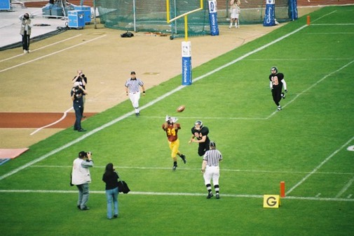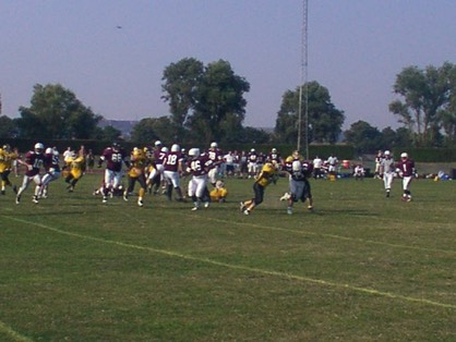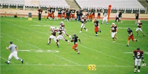 Onto Britball 2005 at Sheffield’s Don Valley Stadium, played under floodlights on Saturday evening, the Aztecs battled to put up a 7-0 score-line through MVP Adam Sparrow off a twenty-one yard interception return. The game then developed into a spectacle worthy of the caveat ‘Defense wins titles’ as the Aztecs soaked up drive after drive from the Cheetahs to clinch the championship!