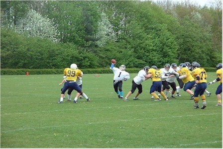 Other teams who made a winning start to the season were the London Blitz who romped to a 44-6 win over the promoted Norwich Devils - Lee Palmer running for 126 yards and 1 TD on just 16 carries, and the surprise package of the year, the Lancashire Wolverines, who defeated Chester 28-14. The Wolverines continued their good form with a hard fought 6-0 win over Birmingham in the first week of May to put them joint top of the Northern Conference with East Kilbride who defeated the Bulls a week later by a score of 26-6. Two Sutherland runs gave the Pirates a 12-0 1st quarter lead, and they moved further ahead in the second half on a hat-trick TD for Sutherland, and a pass from QB Gary McNey to TE Eric Collard.