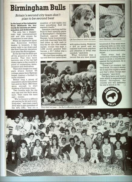 Team Notes: Youth side of the Birmingham Bulls. Made playoffs as a Two Touch side in 1987. Turned kitted in 1988, and won the Youth Kitted Bowl in 1994. Runners up in 1995 and 1990. Made playoffs in every year as a youth kitted side between 1989 and 1996. Returned in 2001 with little success.