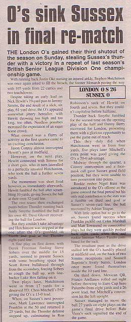 30th August - London O's 20-0 Sussex Thunder, BSL Div.1 Final. Report