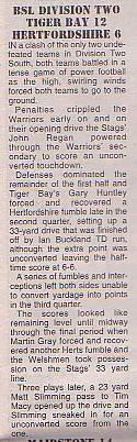 20th June - Tiger Bay Warriors 12-6 Hertfordshire Stags, BSL Division Two. Report