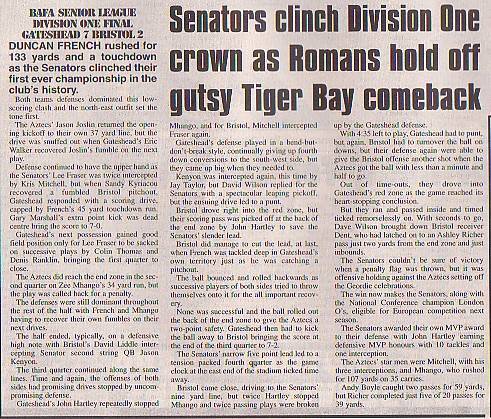 5th September - Gateshead Senators 7-2 Bristol Aztecs, BSL Division One Final.Report