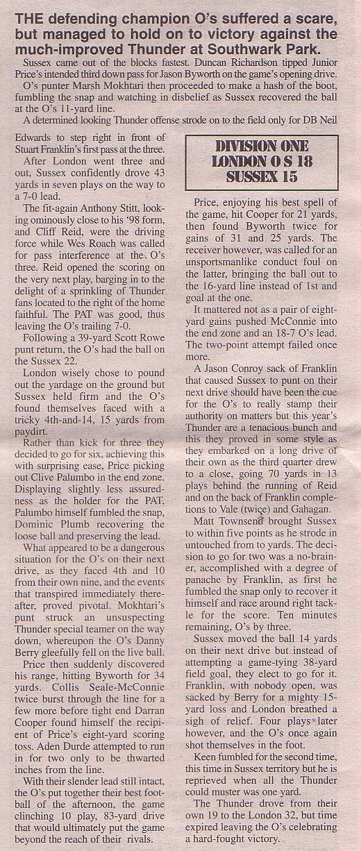 13th June - London O's 26-0 Sussex Thunder, BSL Division One. Report
