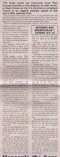 6th September - Birmingham Bulls 26-34 London O's, BSL Division One Final.Report