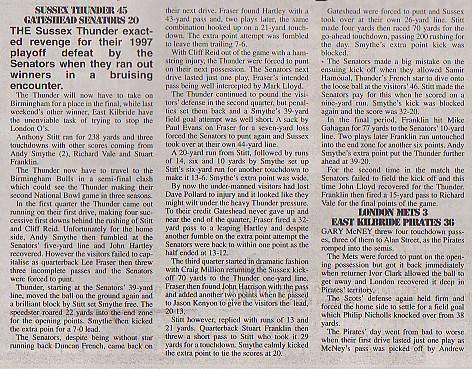 2nd August - Sussex Thunder 45-20 Gateshead Senators, BSL Division One Wild-Card. Report