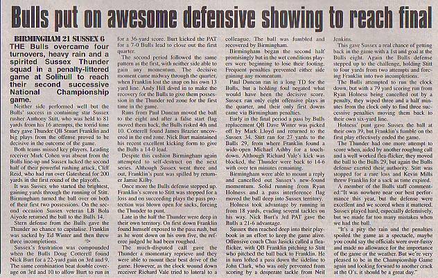 16th August - Birmingham Bulls 21-6 Sussex Thunder, BSL Division One Semi-Final. Report