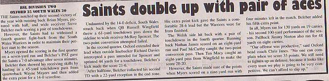 6th May - Oxford Saints 35-20 South Wales Warriors, BSL Division Two. Report