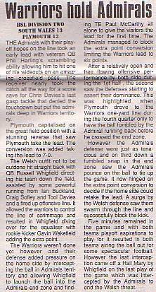 1st July - Plymouth Admirals 13-13 South Wales Warriors, BSL Division Two.Report
