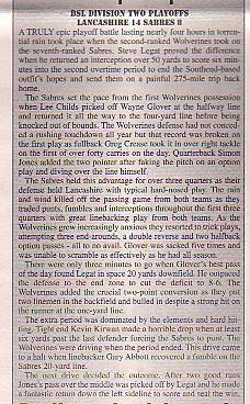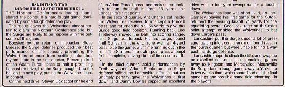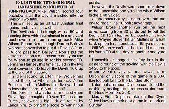 - Lancashire Wolverines 20-34 Norwich Devils, BSL Division Two Semi-Final. Report